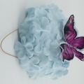 This is one of my ward winning hats. "After the rain" has been inspired by the beauty of the English gardens after the rain. Is beret shaped base approximately 17 cm in diameter. Made from buckram and covered with raw silk and silk shaped flowers fixed with glass beads symbolising the dew over the leaves. The main accent is a floating butterfly, hand drawn by me using Japanese batik technique. This is a showstopper hat, delicate and pretty in powder blue and purple.