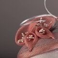 Beautiful dusky pink and silver button headpiece. So versatile and perfect for many occasions- weddings, horse racing ladies days, ladies charity luncheons, retro occasions, registry office marriages, all kinds of occasions! A hand blocked and moulded button base, covered in stunning soft pink and silver flecked fabric, trimmed with dusky pink sinamay banding. The hand crafted sinamay lilies are added to the piece with beautiful white stamens and two swirled silver ostrich spines. This elegant neat headpiece is a medium size and sits beautifully on the side of the head, A milliners hat elastic secures this gorgeous piece in place, truly one of a kind as always from Little Rose Design Millinery.