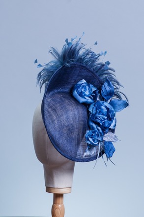 This stunning hatinator design features a large fantasy flower decoration made of pure japanese silk and a goose hackle mount. The sweeping hat base is double layered sinamay fabric. It's comfortable in wearing thanks to a plastic comb hidden underneath and hat elastic, both allowing the headpiece to maintain its position on the left side of the head.