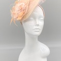 Flowers and vintage net adorn either side with a large lace and silk flower and stripped peach feathers