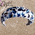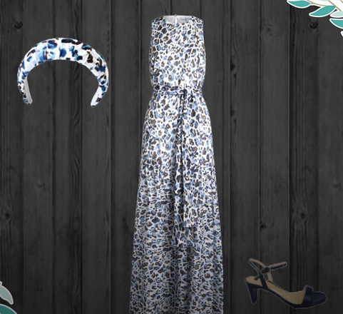 Blue toned, leopard print headband. This item has been handmade to create a unique millinery item, made from buckram, and a beautiful soft cotton Saba fabric, identical to the fabric seen in the Saba dress. Please contact for more information if require, thank you, Emma