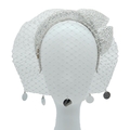 Silver sequins add fun to this veiled headband. A small crinoline halo and twisted bow complete the piece, making it ready for your next event.