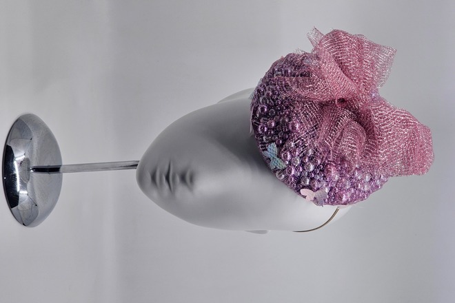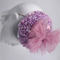 A cute little button headpiece covered in a selection of Lilac, pink and iridescent white beads. An overlay of pink and silver veiling, tied in bow. Sequin butterflies add that special touch