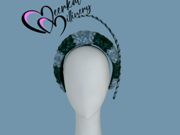 Baby Blue and Green Headband by Meerkat Millinery, trimmed with a single quill, lined with silk and secured with a comb. This handcrafted item takes 9 hours to make.