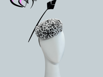 Black and White Lace Button Fascinator by Meerkat Millinery. Lined with silk and trimmed with a single cut feather. Secured with an elastic.Pick up available from Ashgrove QLD.