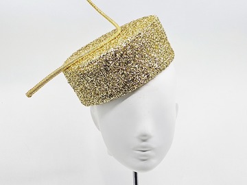 Classic silhouette meets modern opulence. This striking gold pillbox features a fluid quill detail that adds height and drama, while its shimmering finish ensures a radiant glow from every angle. Timeless, bold, and brilliantly refined."